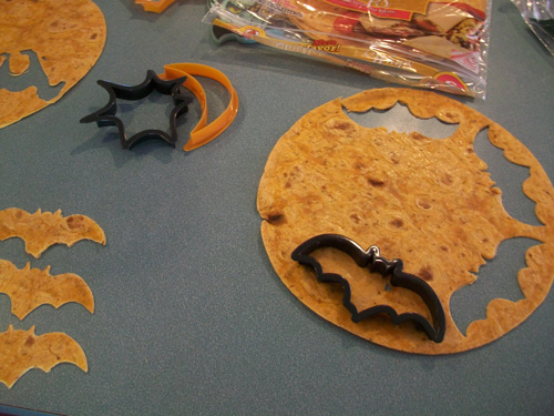 3. Press the cookie-cutters into the tortillas and shift back and forth a little bit, ensuring that they are cutting all the way through. If you are using plastic cutters, as I did you may need to flip them over and assist with the cutting a bit by pressing your finger over the yet uncut areas.