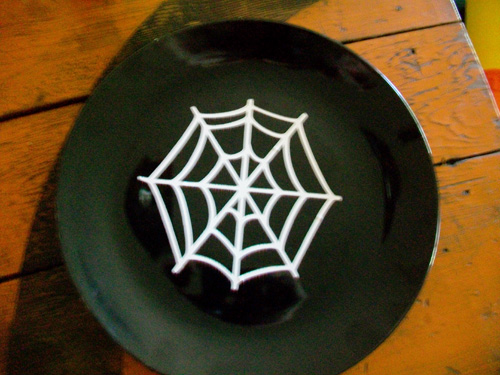 To serve them on I made a spider webbed black serving plate. I bought the black plate at the dollar store and cut a spider web out of white vinyl on my Cricut, using the Happy Hauntings Cartridge.