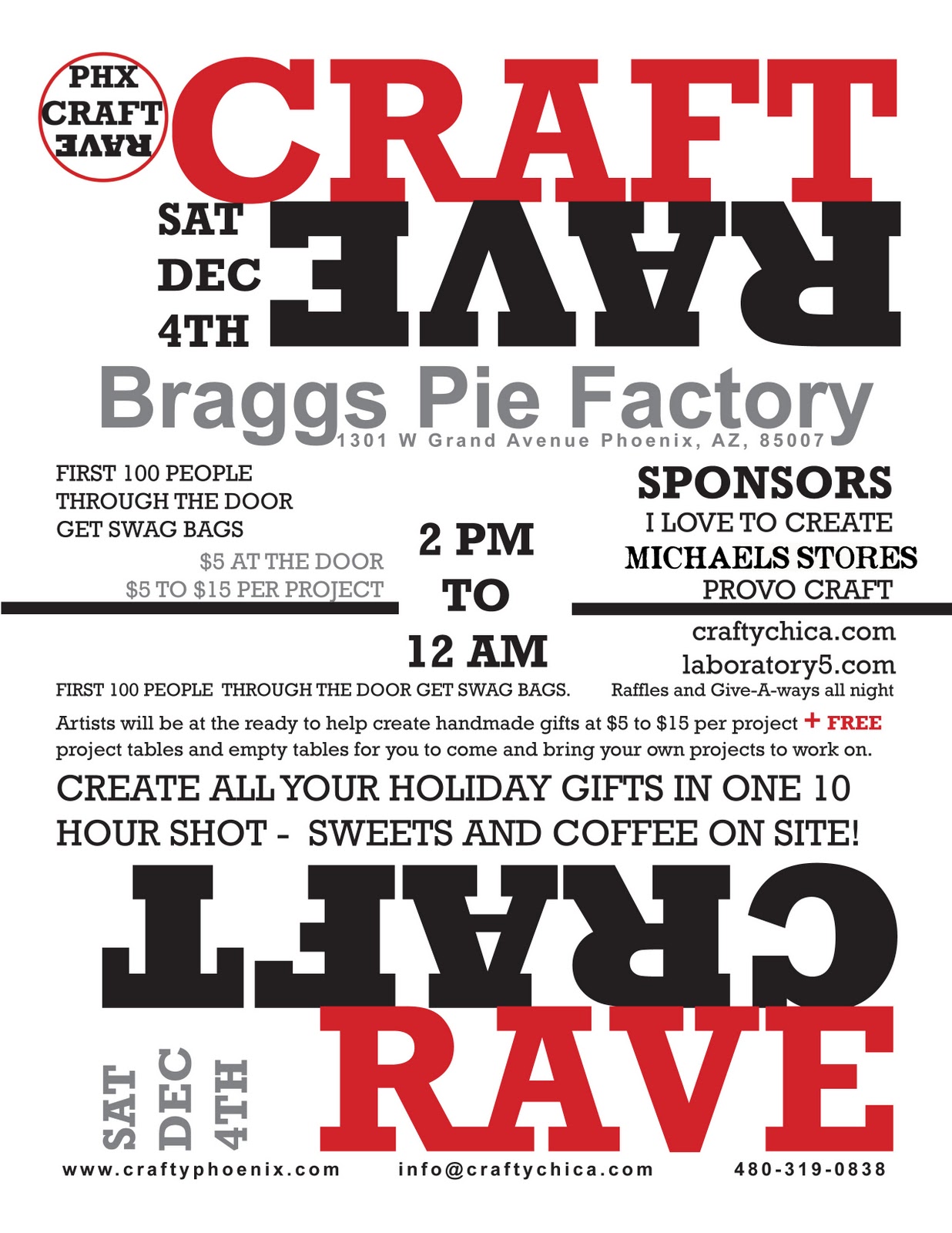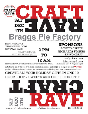 Then on Saturday from 2 pm-midnight is the first ever Phoenix Craft Rave! At Bragg’s Pie Factory, 1301 W. Grand Avenue, Just $5 at the door and then you can choose from more than a dozen $5 – $15 craft projects to make. Local artists will have tables to provide you with the supplies and instructions. They’ll also have their work for sale too! There are free project tables, free treats and free beverages. Come get crafty – we’ll help you make for everyone on your list.